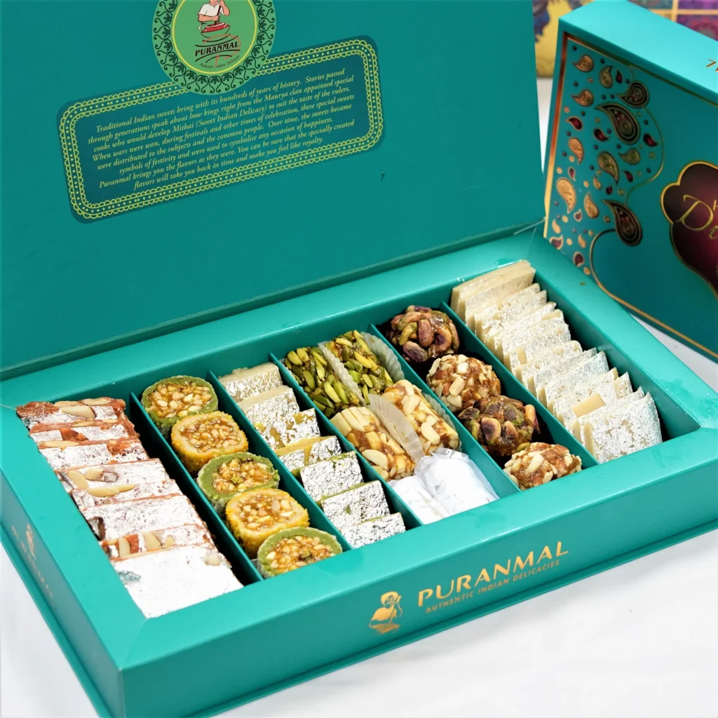 This Diwali, Puranmal offers a variety of options to cater to different tastes and preferences. Choose from specially curated gift boxes, hampers, or trays, each adorned with carefully selected treasures of Indian sweets. Whether you opt for the richness of traditional mithai or the innovative twists on classic recipes, Puranmal ensures a delightful journey through the diverse world of Indian sweets.