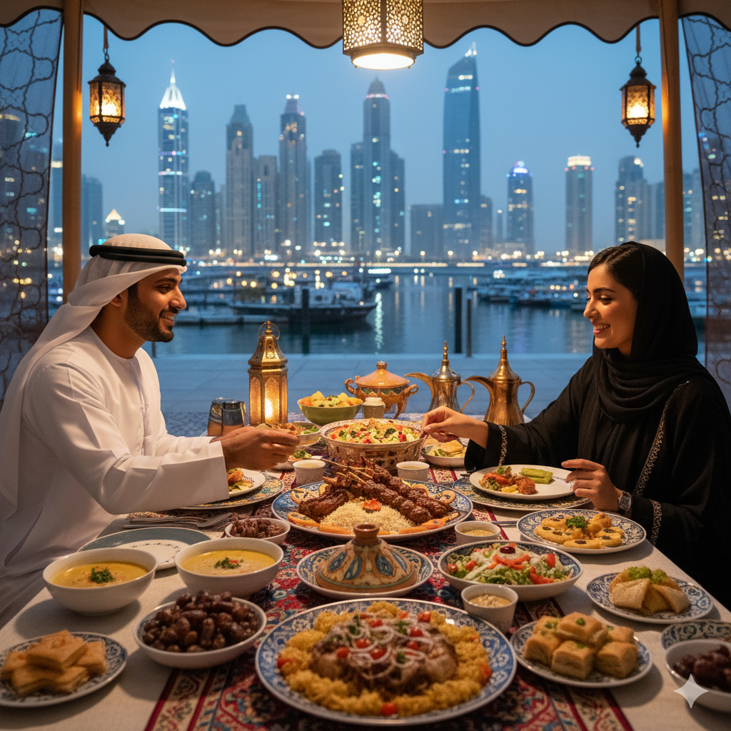 Families break the fast at sunset with Iftar. They then share the Suhoor, the final meal before dawn, often extending well past midnight. Hotels and restaurants across the city host lavish Iftar buffets and serene Suhoor tents. People seek venues with special ambience, ranging from traditional majlis settings to spectacular dining experiences overlooking the Dubai skyline.