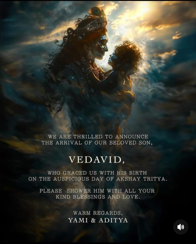 The ecstatic parents took to Instagram to share their joyous news. They posted an adorable announcement, “We are thrilled to announce the arrival of our beloved son, Vedavid, who graced us with his birth on the auspicious day of Akshay Tritya. Please shower him with all your kind blessings and love. Warm regards, Yami & Aditya.”